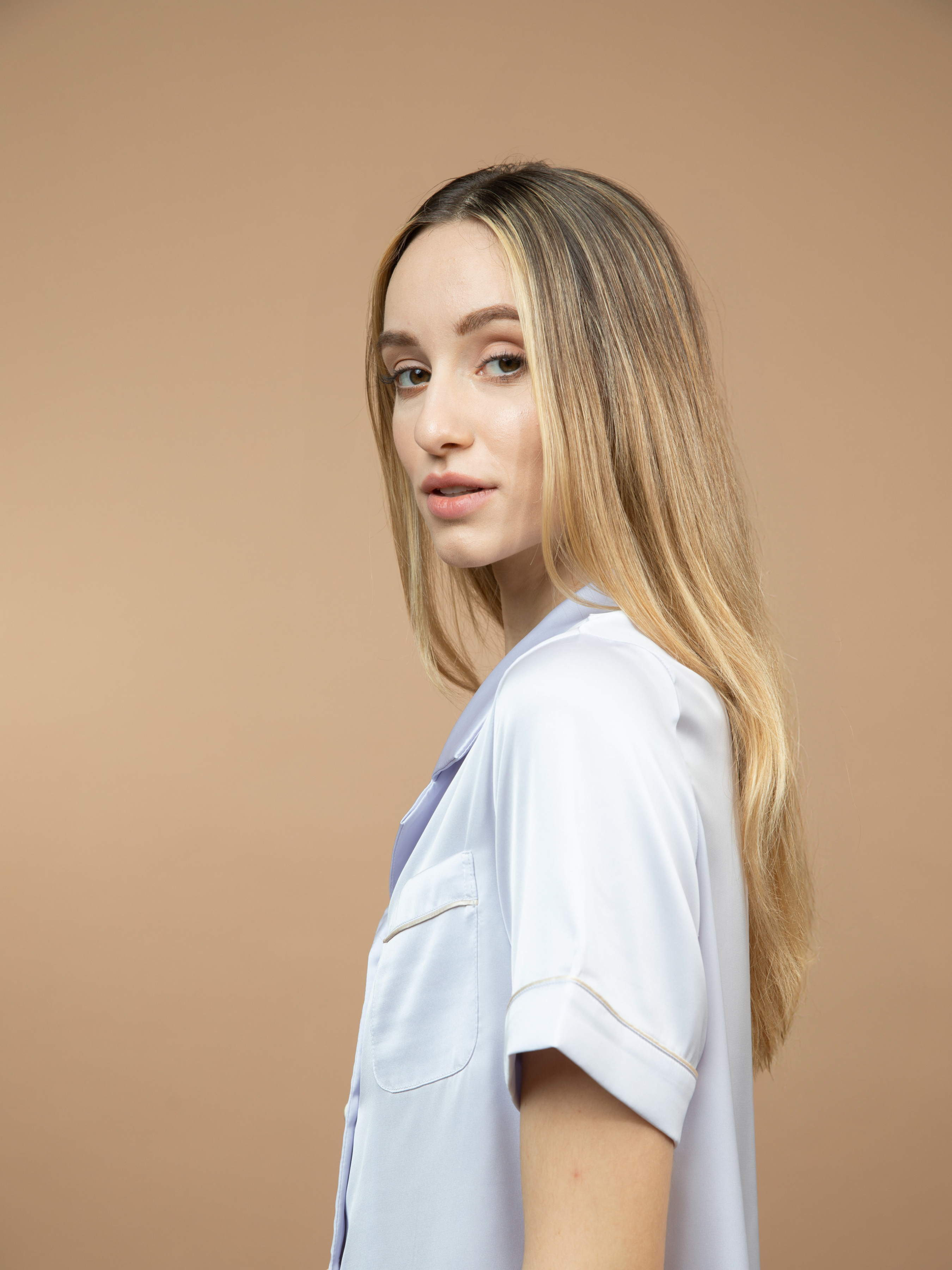 Meet the Amara, Fantasy’s latest take on the effortlessly chic short pajama set, hand crafted, Dress in timeless soft purple with sleek ivory piping, she’s finished with our signature buttons for a refined touch. Perfectly poised for evenings of indulgence Amara is the epitome of relaxed luxury.
